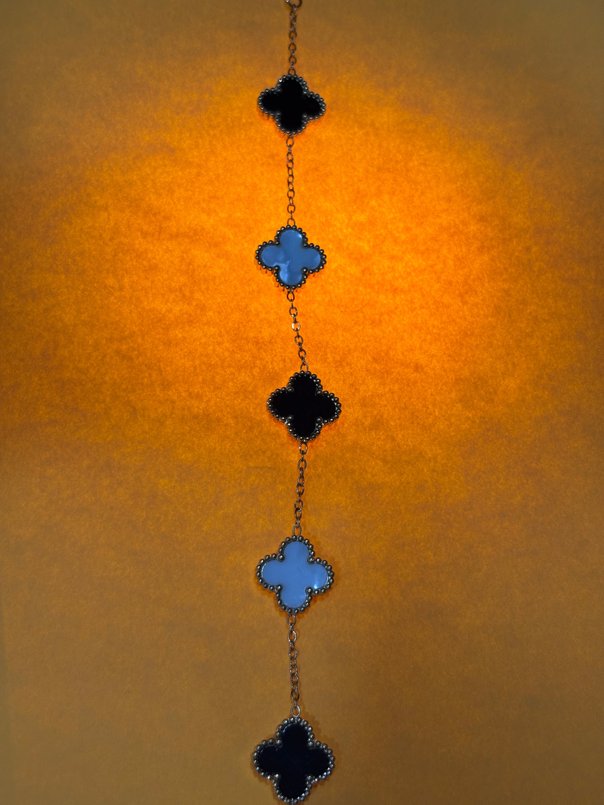 A timeless symbol of elegance and balance, this bracelet features alternating black and white clovers framed in golden detail. Its versatile design lets you style it your way — wear it with all black for bold sophistication, all white for pure grace, or mix both for a chic contrast. Perfect for adding charm and luck to any outfit.